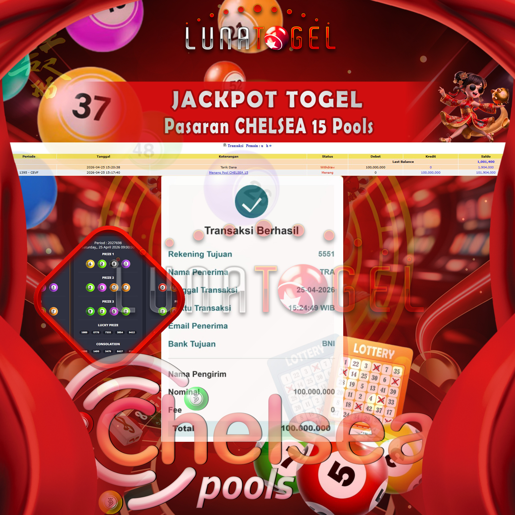 Selamat Kepada User ID : uxxh berhasil Melakukan Withdraw Sebesar Rp.100,000,000,- Meraih Kemenangan Di CHELSEA 15